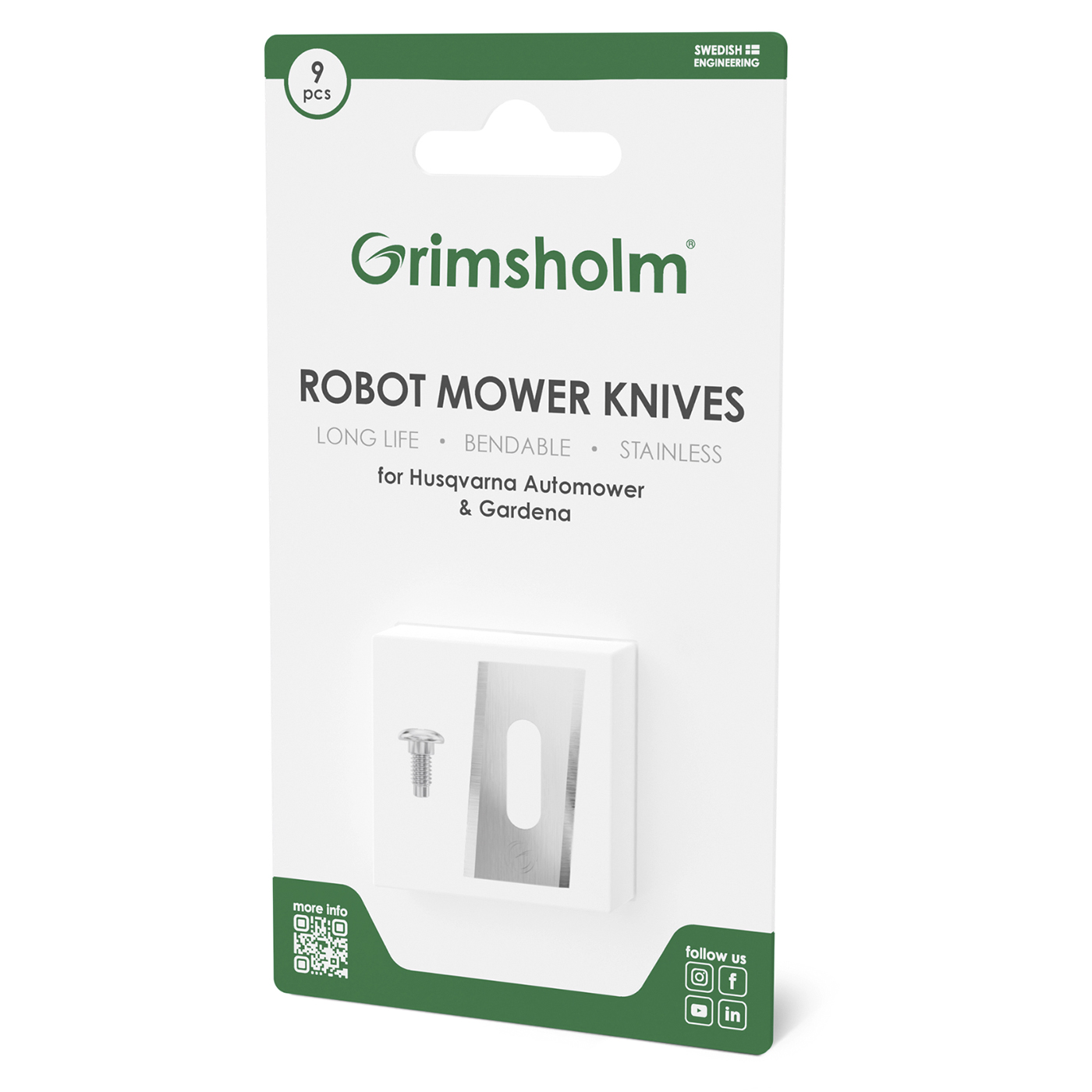 Denne praktiske 9-pakningen inneholder høykvalitets turn-around-kniver fra Grimsholm, komplett med festeskruer. Knivene tilsvarer Husqvarna Endurance og leveres i en smart forpakning som enkelt åpnes bakfra – du trenger ikke åpne hele pakken med én gang.